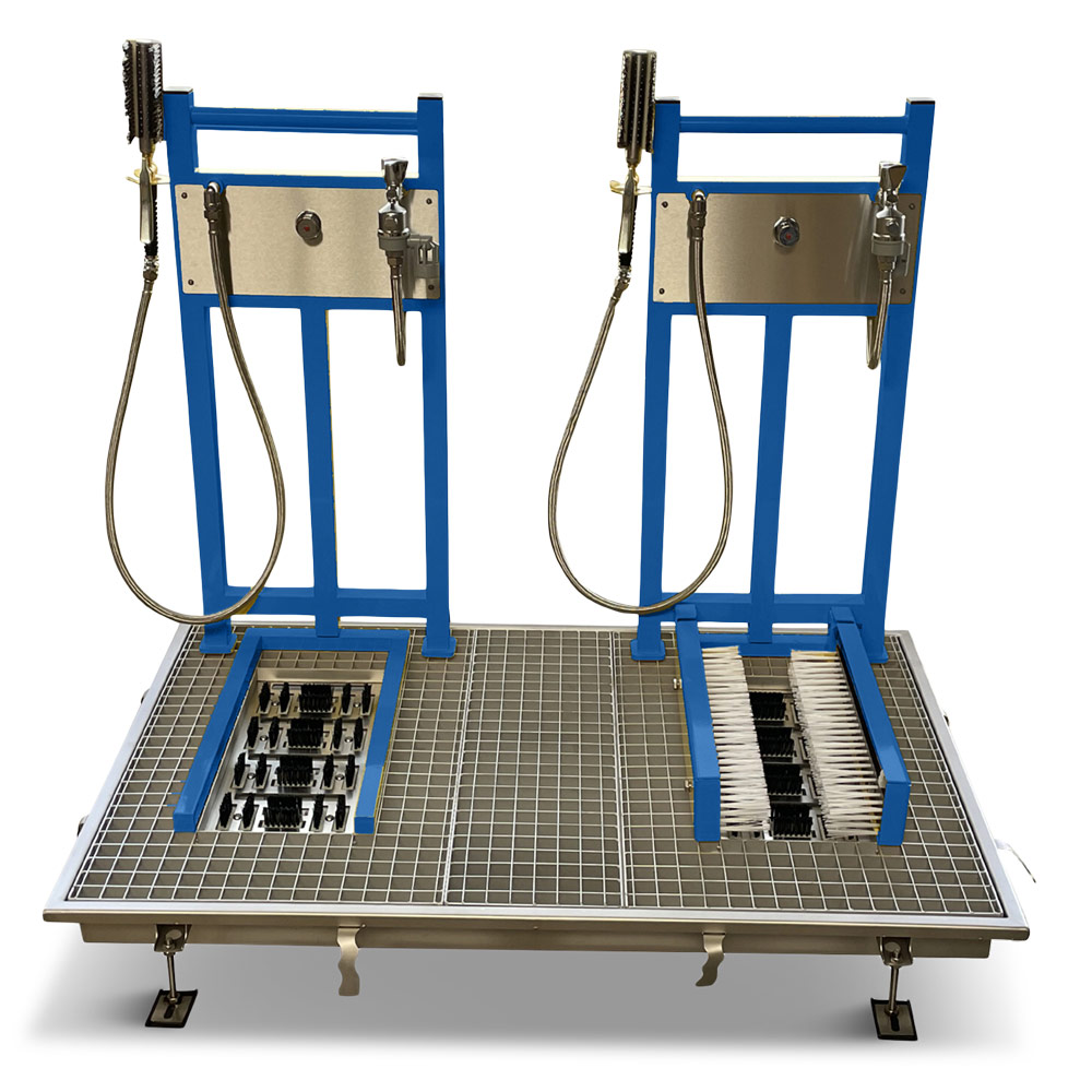 The "Boot and work shoe washer flush to the floor" can be installed at ground level or partially recessed. It has a stainless steel tray with a central drain and odour trap. The stainless steel grating contains side brushes, sole brushes and water spray nozzles made of stainless steel as well as a foot valve for water control. A retaining bracket with water stop valve and a system separator in accordance with DIN EN 1717 is also integrated. A water-bearing hand brush enables precise cleaning. The system is frequently used in the construction industry, horticulture, agriculture and by blue light organisations.