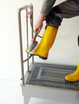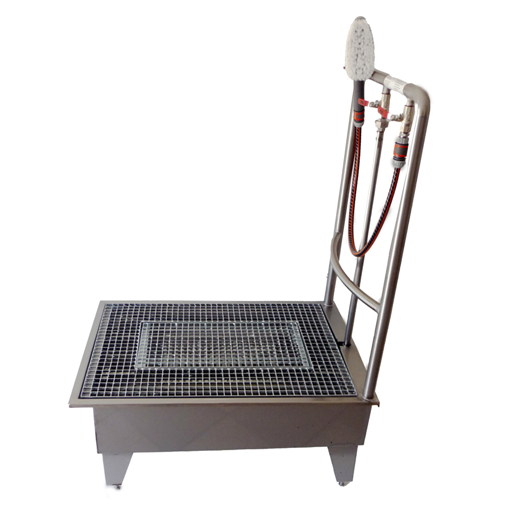 Small nozzles spray water on the bristles and shoes from all sides. The jet sprays can also be moved by hand, making the water direction adjustable and the device therefore also suitable for work shoes. Dirt is easily removed from boots or work shoes when they are rubbed against the lower and side brushes. A drain underneath the tub, with integrated sludge collecting tub and odour trap, drains water and eliminates bad odours from the drainage system.