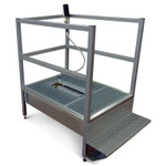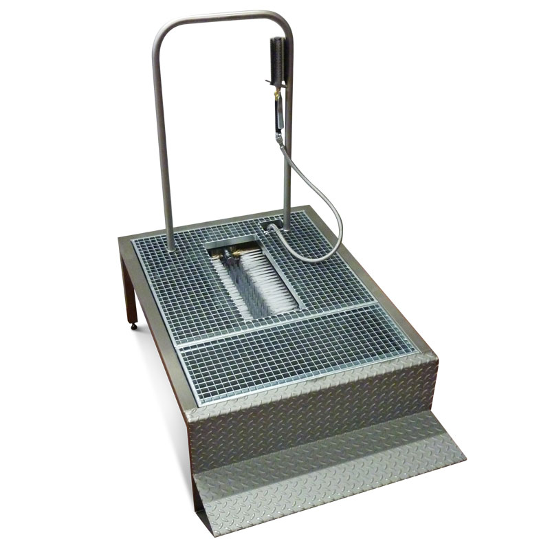 The boot washer is installed at ground level, on the floor. Adjustable feet provide a secure footing. The railing offers additional protection and support possibilities. As an option, a version with holding bracket is available instead of the railing.