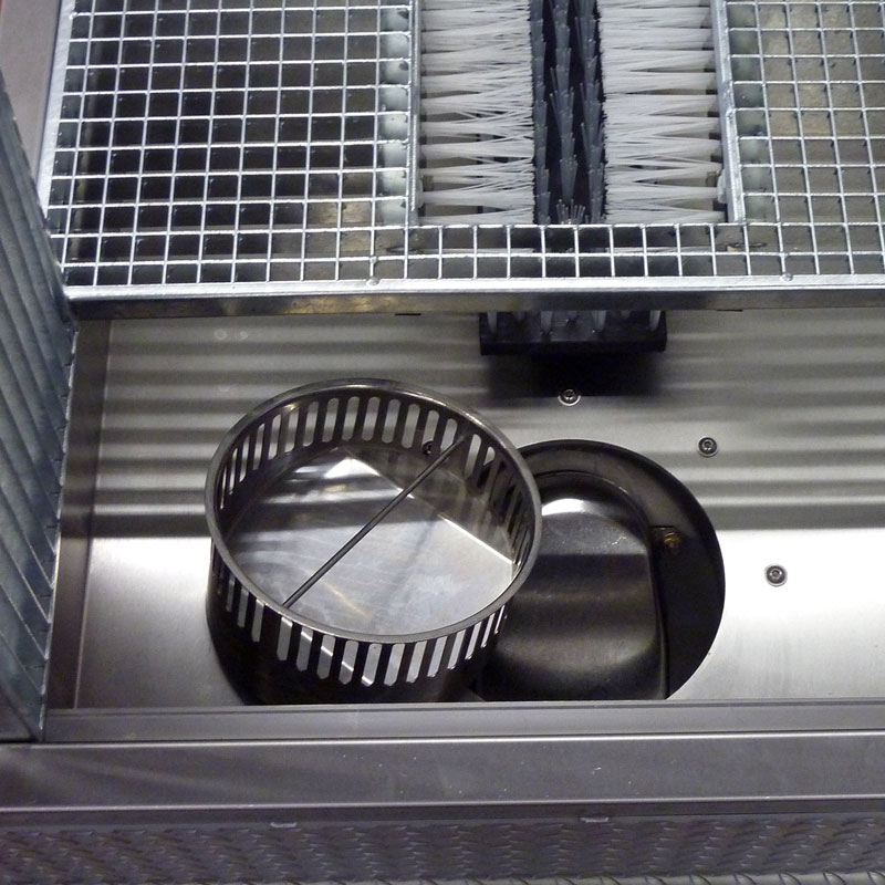 The tray of this boot washer is covered with two hot-dip galvanised gratings with a central cut-out. An automatic water stop valve is attached to the front of the cut-out, which is operated with the tip of the foot. Lateral flushing pipes conduct the water over the brushes to the footwear. A water-bearing stainless steel hand brush (with shut-off via a hand lever quick closing valve) allows additional manual cleaning of the boot shaft or other objects to be cleaned. A drain integrated in the stainless steel tub of the boot cleaner with sludge trap and odour trap enables optimum water drainage and separate collection of coarse dirt. The front grate can be removed for easy cleaning of the boot washer and emptying of the sludge trap.