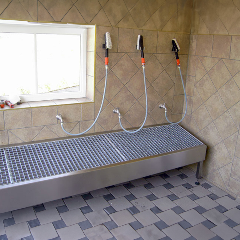 For cleaning the dirty footwear, the boots and shoes can be conveniently positioned on the grid of the washing trough. The shoes are cleaned quickly and thoroughly with hand brushes and externally supplied water. The contaminated wastewater is collected by the large channel and automatically discharged into the drain, which prevents large-area distribution of moisture and dirt. The drain of the boot washing trough can optionally be equipped with a sludge trap and an odour trap (see options). The boot washer can be equipped with protective walls for additional protection against splash water (see options).