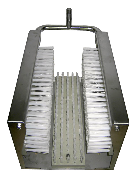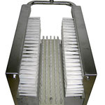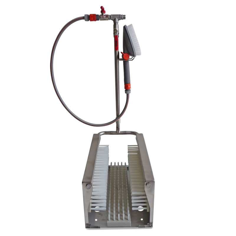 The Boot washer grid-installation is made of high-quality, 2mm thick stainless steel sheet. For the thorough cleaning of the sole profile, it is equipped with a sole cleaning brush with very hard bristles. With the two side brushes, even heavily soiled sole edges can be easily cleaned.