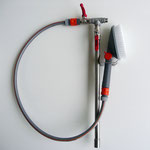 Above the side brushes are spray bars, which guide running water over water jets onto the boots. The combination of running water and brush rubbing allows easy, efficient and flexible cleaning of heavily soiled boots. In addition, this boot washer is supplied with a water-bearing hand brush, which can be used to clean the boot shafts and other equipment items.