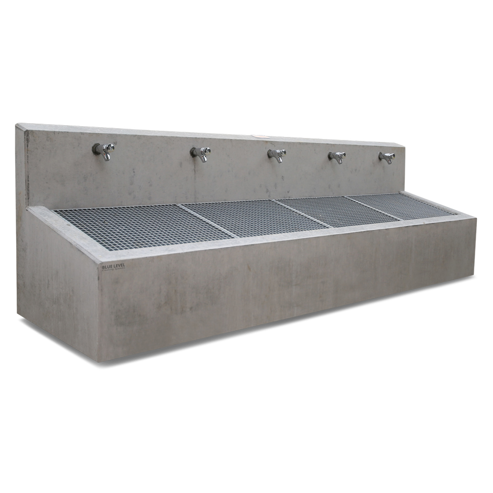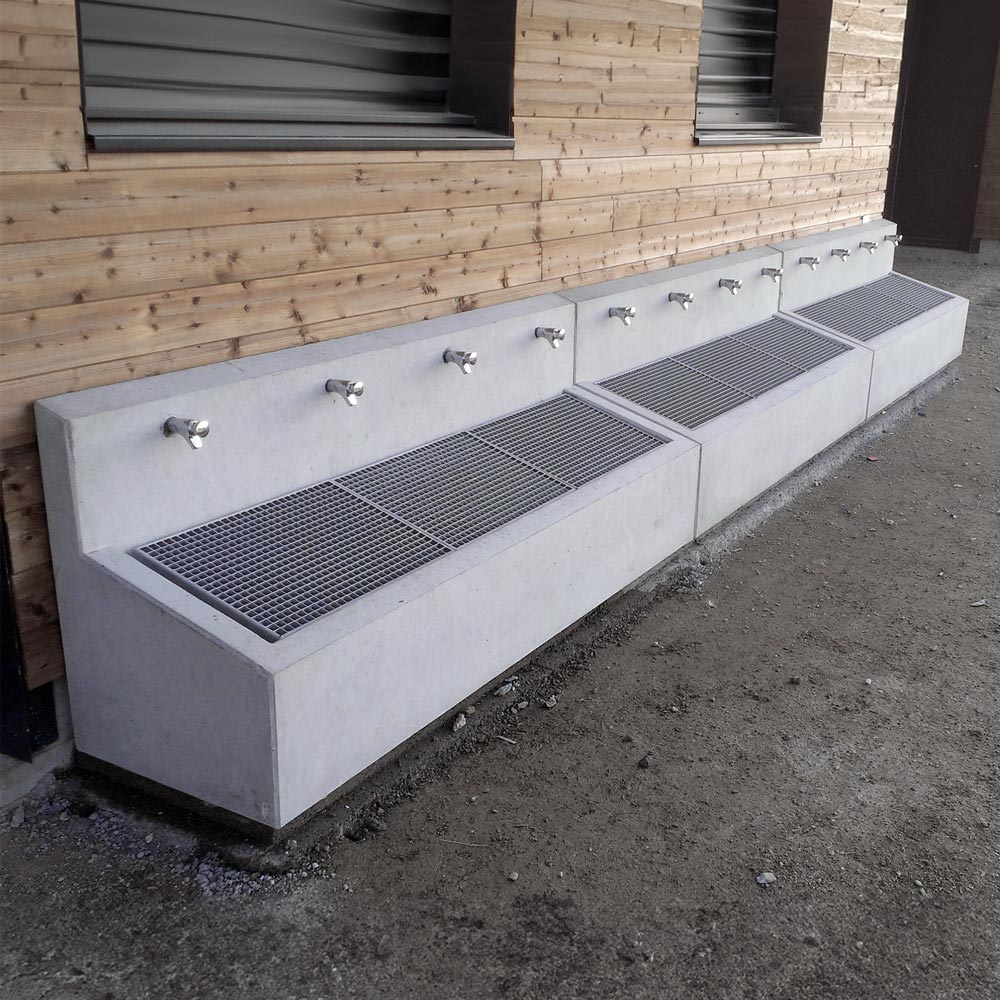 The shoe cleaner is made of smooth concrete and has chamfered edges, which gives it an extraordinary robustness and longevity. The washing system has an integrated concrete rear wall to prevent heavy spraying of contaminated water. This means that the shoe washing system can be placed directly on the back wall of any facade without having to fear that it will be severely affected. The gratings made of galvanised steel are also characterised by their robust construction. They can be easily removed for thorough cleaning of the system.