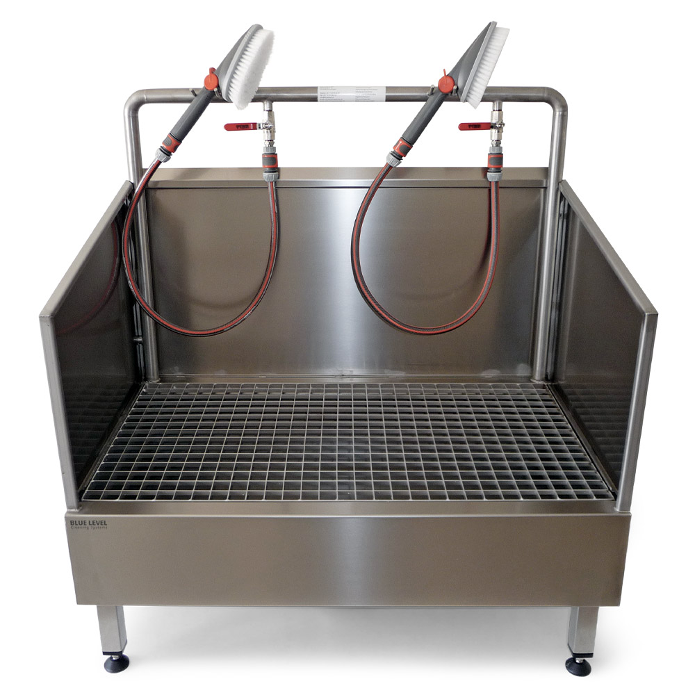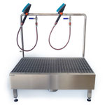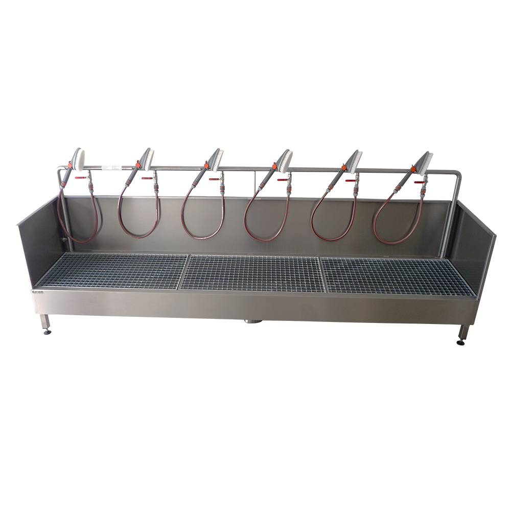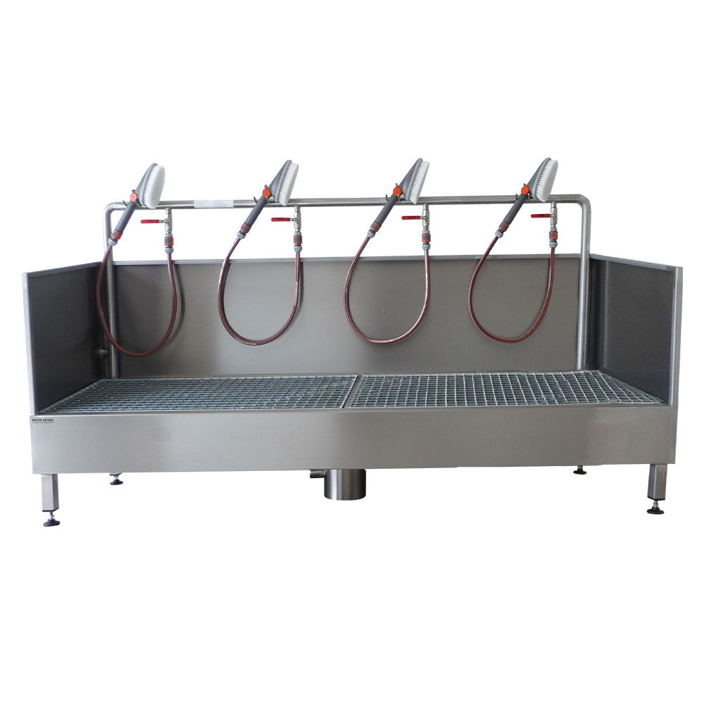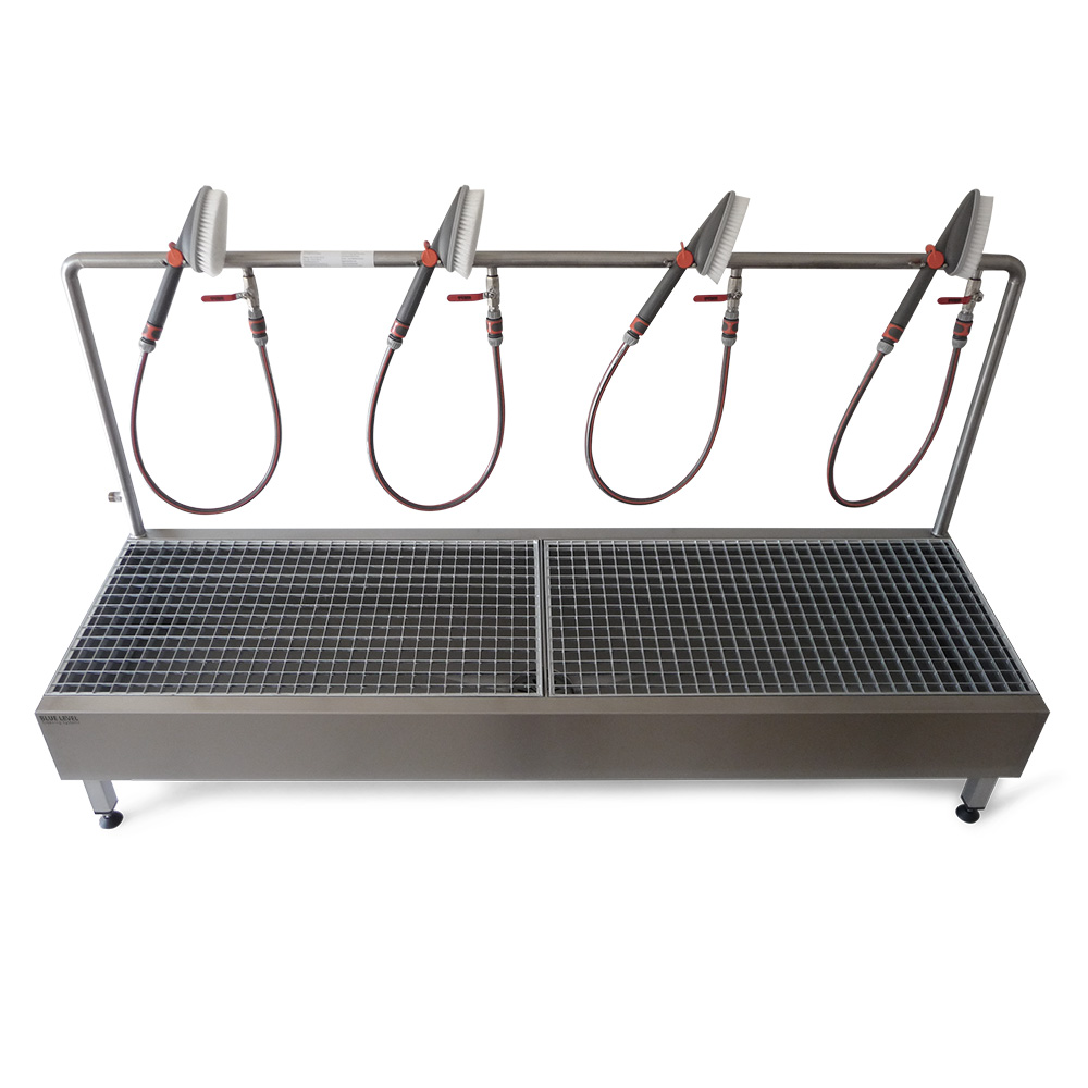 The use of high-quality stainless steel ensures a long service life and durability of the washing system. The removable grating enables easy cleaning. The height of the system can also be customised using the adjustable stainless steel screw feet.