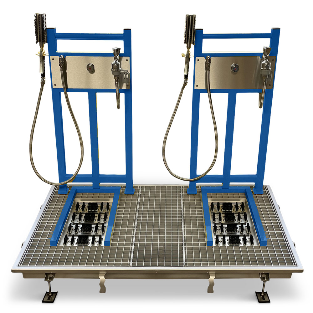 The stainless steel tub of the shoe washing system has a central drain with a removable stainless steel grate in the centre. This grate is equipped with an integrated