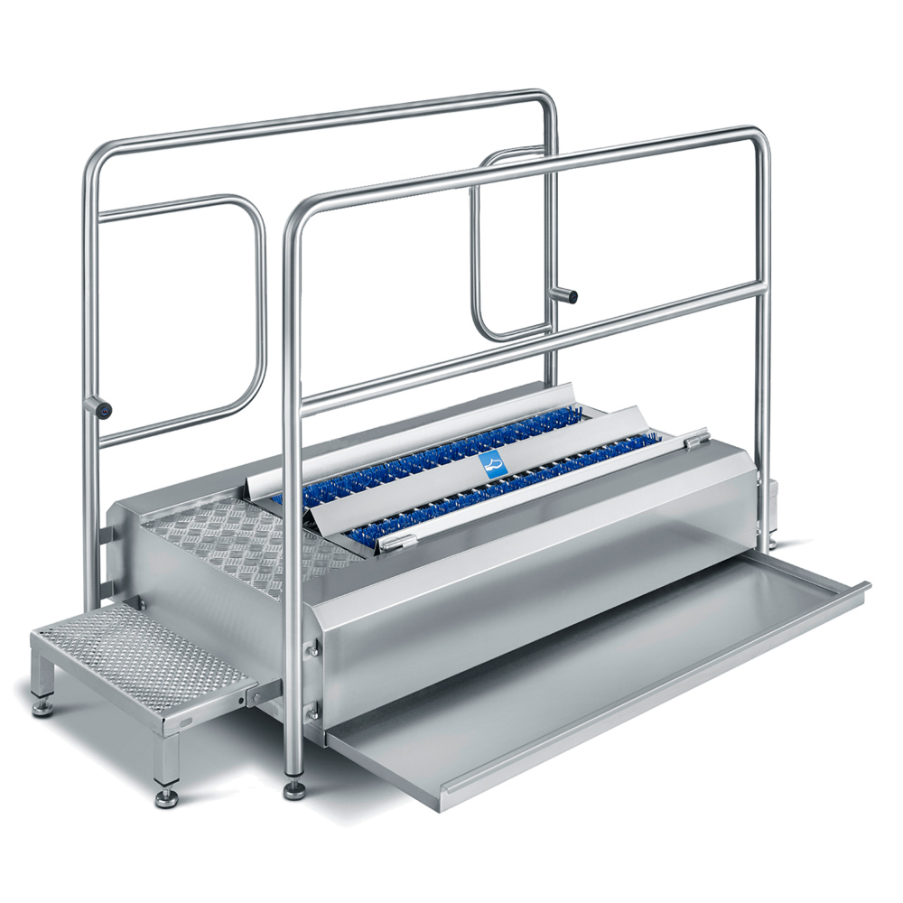 enters the bottom cleaning system. The user moves on a stainless steel grid through the continuous sole cleaner. The high-quality nylon bristles of the roller brushes protrude through the grate.